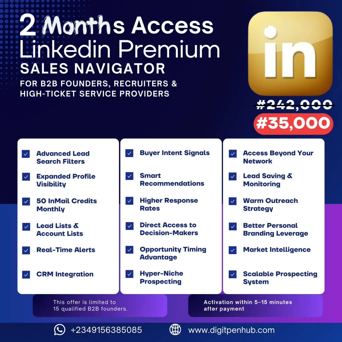 You’re paying for 2 months access activation to LinkedIn Sales Navigator so you can use advanced lead targeting, InMail, and lead monitoring.